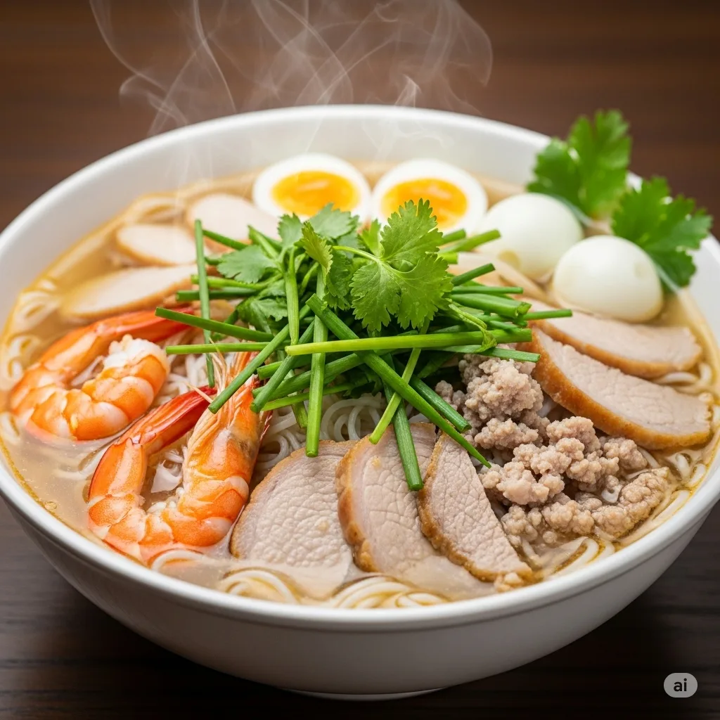 - Nước dùng: Phải trong vắt, có vị ngọt sâu tinh tế từ xương hầm nhiều giờ, không gắt vị bột ngọt, và thoảng mùi thơm đặc trưng của hải sản khô nướng.
